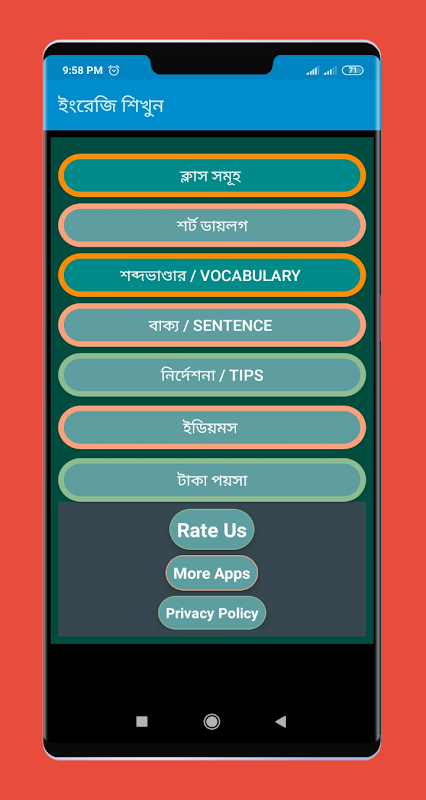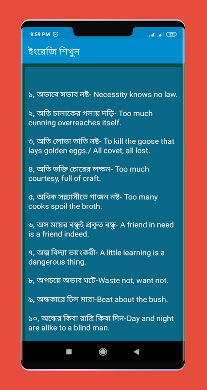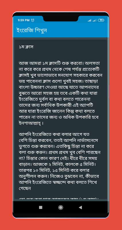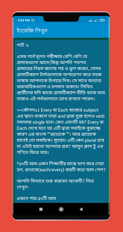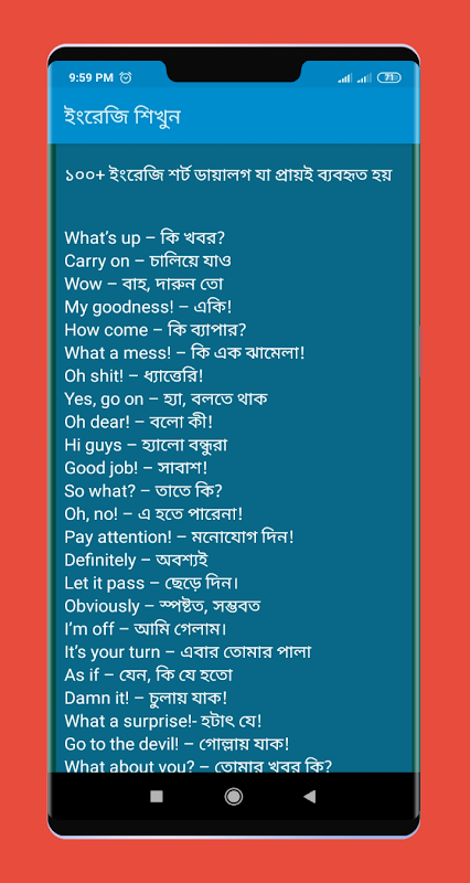 খুব সহজেই আপনি ইংরেজি শিখতে পারবেন এপটির মাধ্যমে। এতে রয়েছে কিছু অধ্যায়, শব্দ ও বাক্য গঠনের উপায়। আপনি খুব সহজেই গ্রামার আয়ত্ব করতে পারবেন অধ্যায়গুলো পড়লে। ইংরেজি শেখার জন্য খুব সুন্দর করে সহজভাবে সবকিছু উপস্থাপন করা হয়েছে।