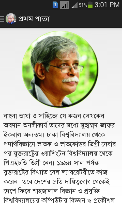 Muhammed Zafar Iqbal is one of the pioneers of science fiction in the Bangla language. He mainly writes for younger readers in bangla . Muhammed Jafar Iqbal is best known for his novels for youngsters and science fictions in bangla. Muhammed Zafar Iqbal (Bengaliborn 23 December 1952) is a professor of Computer Science and Engineering and also head of the department of Electrical and Electronics Engineering at Shahjalal University of Science and Technology.Muhammed Jafar Iqbal also wrote several non-fiction on physics and mathematics in bangla . He writes column in Bangla mainstream newspapers regularly. This app is a collection of those columns.