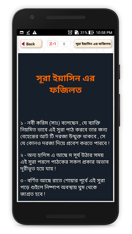 surah yaseen is an educational app. surah yaseen in bangla is very easy to read and understand. surah yaseen audio is recited here so nicely. surah yaseen mp3 is only available when you will connected with internet. Without internet you can read arabic and bangla uccharan as well as bangla meaning of sura yasin.
