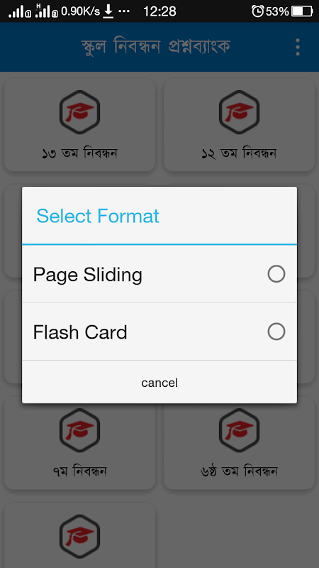 This app has been developed with previous years question of school registration examination question and answer . This app contains 900 more mcq . This app contains 3 screens . First screen contains year number list . Second screen contains mcq , By sliding user will find next screen . User can select any question by typing question number . In third screen, there is option for examination with flash card