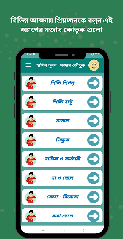 Our beautiful Bengali jokes app Hasir Bhuban - funny jokes are arranged with selected best jokes. As Bengali speaking people, almost all of us like to read Bengali funny jokes. In our busy life, when we are tired due to work pressure or different surroundings, different people try different ways to enjoy or get pleasure, like some people try to bring joy and peace by reading Bengali jokes from different online media or offline apps. Many times we like to make others happy by telling jokes in various chats or events with friends. Our Hashi Bhuvan - Funny Jokes app is just for those who love funny jokes.