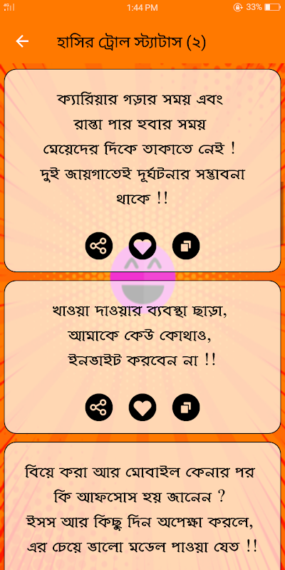 ‘হাস্যকর ছন্দ ও স্ট্যাটাস’ অ্যাপটিতে রয়েছে হাসির সব নতুন নতুন ছন্দ ও স্ট্যাটাস। যা আপনাদের অবশ্যই ভাললাগবে।