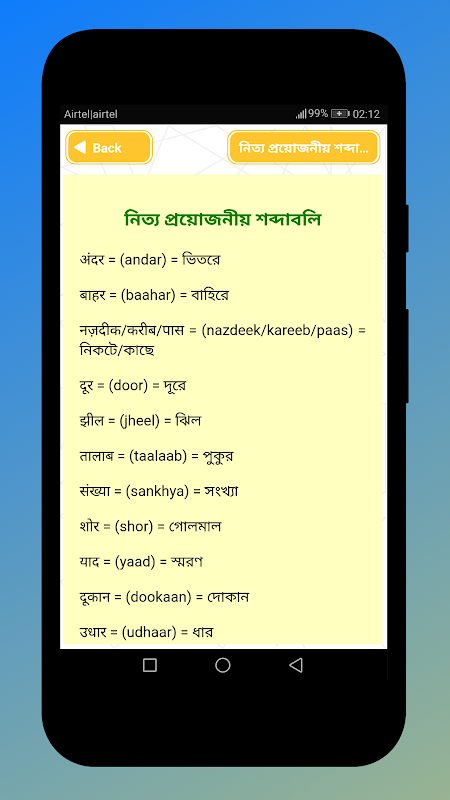 There are about 100 crores people who speaks hindi. This a hindi learning app offline. You can find so many hindi learning book free but they are online. Learn hindi in bangla is a offline version of hindi speaking course. This will be very useful for those who want to learn spoken hindi through bengali. For people in bangladesh and west bengal it will be a great hindi learning course in bangla.