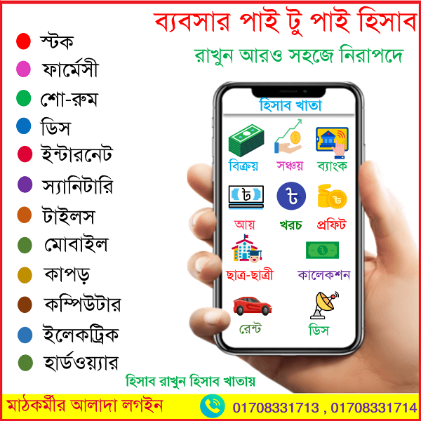 স্টক, ডিস, ইন্টারনেট, মাদ্রাসা, কোচিং, স্কুল, লাইব্রেরি, ফার্মেসির হিসাবের অ্যাপ