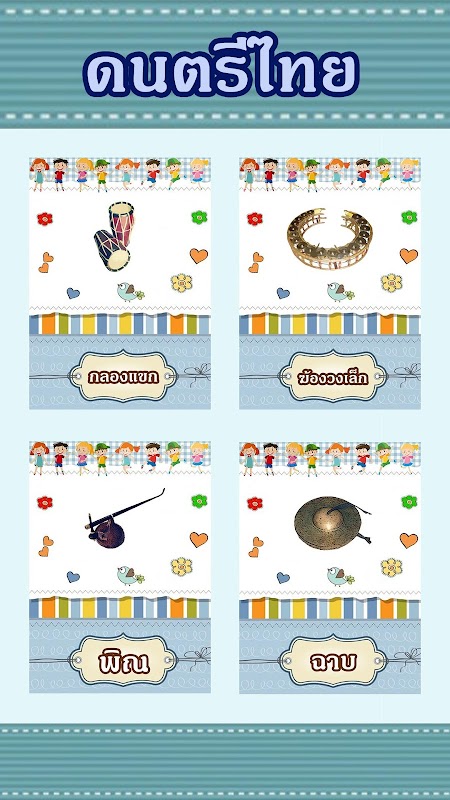 แอพเรียนเรียนรู้เครื่องดนตรีไทยที่พบได้ในชีวิตประจำวันและเครื่องดนตรีไทยที่หายาก เช่น รำมะนา ขลุ่ยเพียงออ ชัดเจน ภาพประกอบสวยงาม น่าเรียนรู้ ทุกๆคนจะชอบอย่างแน่นอน