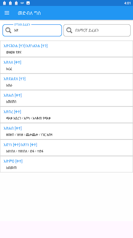 This ግእዝ መድብለ ግስ|Geez Verb study application is an essential tool for anyone studying the Geez language or seeking a better understanding of Ethiopian ancient literature and wisdoms. The application provides a comprehensive resource for translating Geez verbs into Amharic which is essential to study the language. With its user-friendly interface and extensive database, the application is valuable aid for learners at all levels, from beginners to advanced students. Overall, the Geez Verbs dictionary application represents a highly useful and convenient means of unlocking the wealth of knowledge contained within the Geez language.