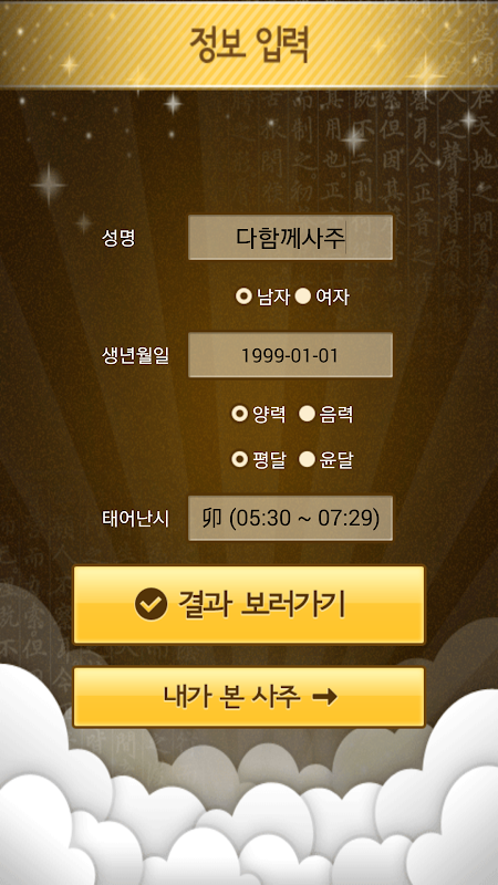 내가 어떤 사주를 타고 태어났는지 한번쯤은 궁금하셨죠?사주는 물론 토정비결,손금,화투점,부적,오늘의 운세까지지금 확인하세요. 물론 무료!!