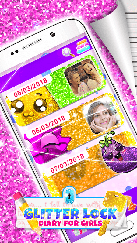 Download ✨Glitter Lock Diary For Girls✨, write your secrets and feel relaxed because nobody can ever see your “diary entries”! They will be safe in our “cute diary with lock password for girls”! Also, you can decorate your “sparkle diary” with cute emoticons which will match your current mood. So, don't hesitate to tell your “digital diary” if you are in love, if you have some problems with your boyfriend, or you have a top secret that you don't want to share with anybody.
