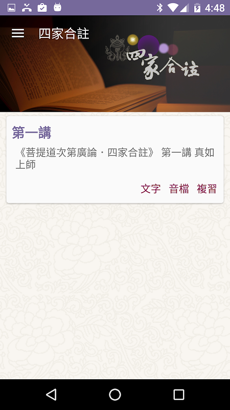 為《菩提道次第廣論》作全文註釋的論典,卻非常少見。正是因應了學法者的需求,在十九世紀初,誕生了《菩提道次第廣論.四家合註》這部多樣而全面的《廣論》註釋,其中總集了巴梭法王、語王堅穩大師、妙音笑大師、札帝格西這四位大德所著的箋註。《四家合註》問世以來,得到諸大德們的推崇。