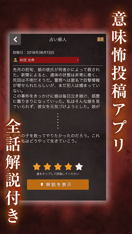 全てがオリジナルの意味怖投稿アプリ。全話解説付きでご紹介。 人気投稿者の意味怖がまとめて読めるのはこのアプリだけ。