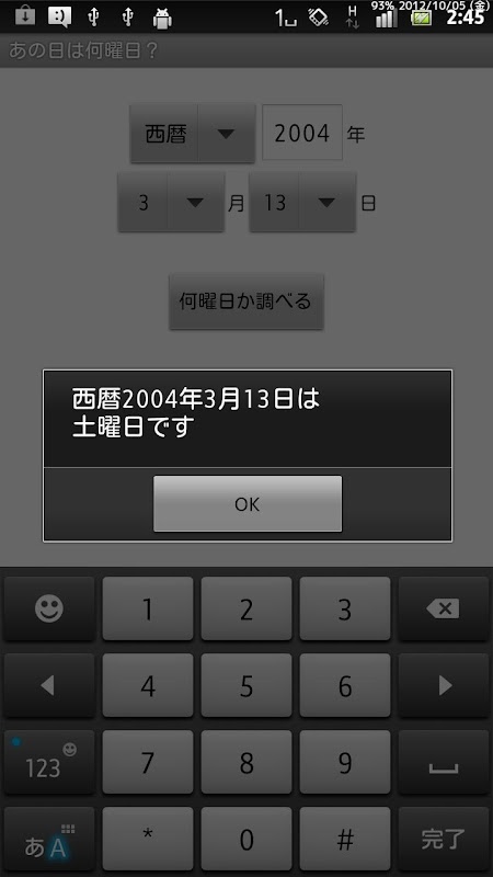 When you enter year, month, day, the day of the week is displayed. The year's input corresponds to 5 AD, Meiji, Taisho, Showa, Heisei.