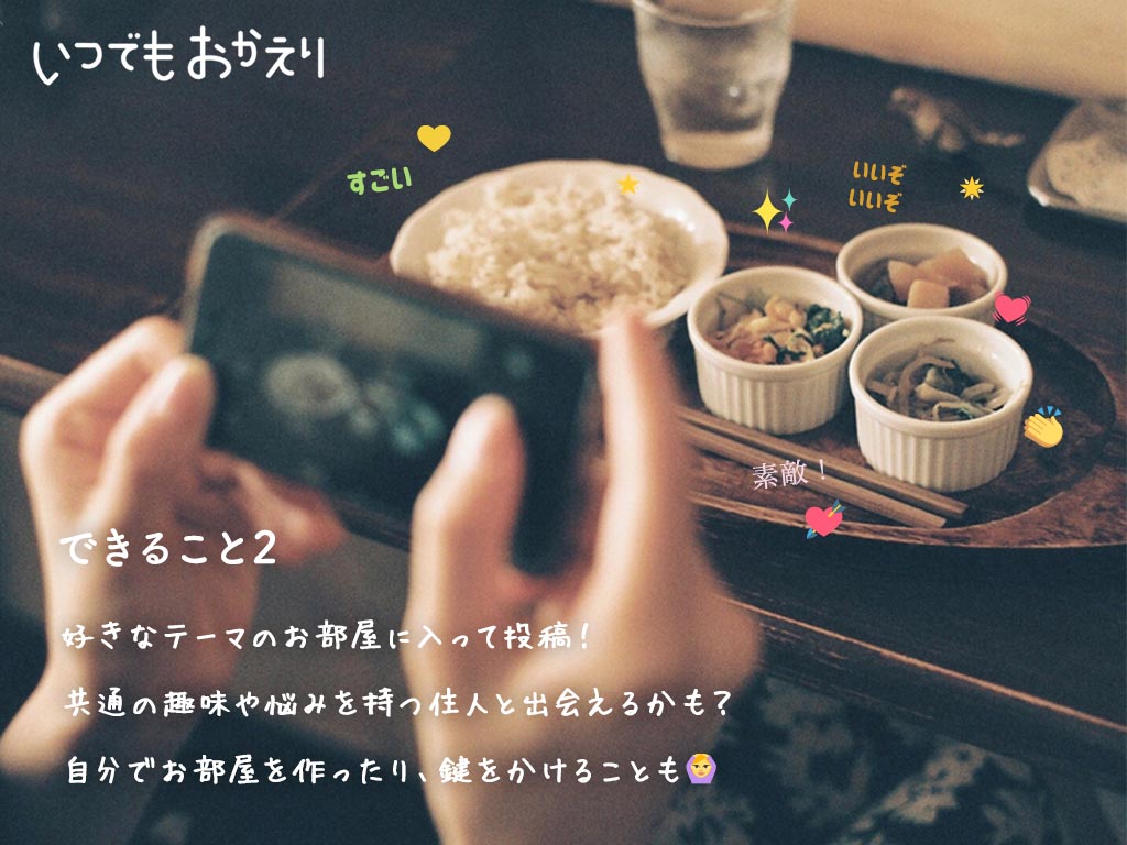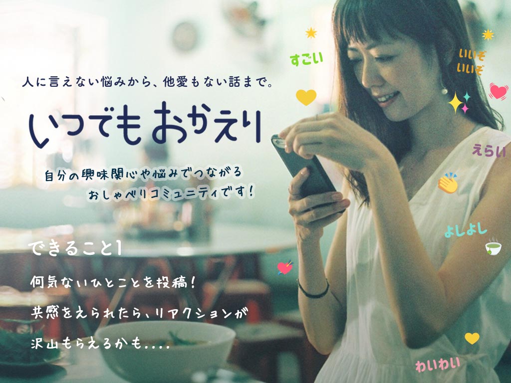 In addition, although you can easily share your feelings online such as SNS, you may receive heartfelt words and accusations from strangers due to "spreading" and "flaming" of posting. .. .. That is where the self-care community "Welcome back anytime" was born. A completely new, but somewhat nostalgic community app designed with the concept of "accepting feelings" and incorporating specialized knowledge such as "keep saying and listening" in mental health. Enjoy online communication with peace of mind and peace of mind while maintaining a gentle connection without being strongly denied by anyone.