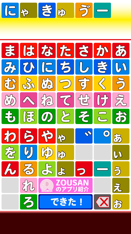 It is "Shiritori play" application. You can play "Shiritori" by arranging hiragana Natsumi.Sounds when the letters are arranged.
