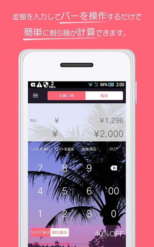 金額を入力し、下部のバーをスライドして、割引率を入力します。この時、%OFF表示と、割引と2パターンの表示を選ぶ事が出来ます。もちろん、税込と税抜のボタンを押すだけで、税込、税抜の金額が簡単に計算出来ます。計算した金額をリストに追加し、保存する事ができます。