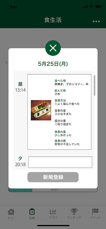 ・Daily weight/blood pressure record and graph, meal record with photos, medical checkup record