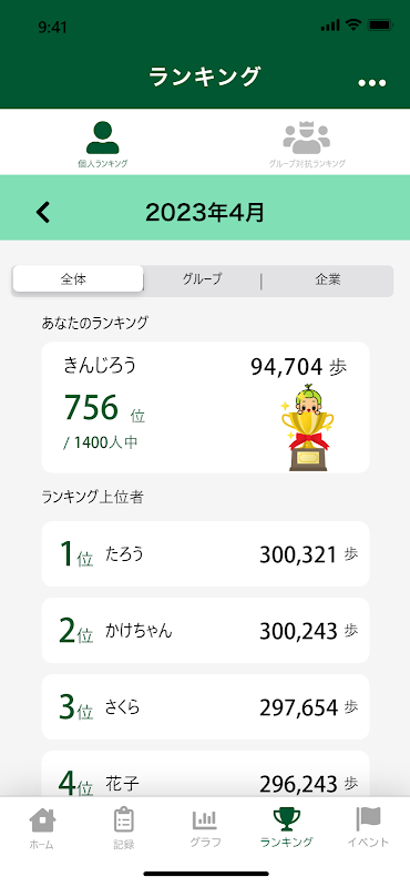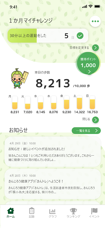 In addition, you can work on your health while having fun, such as a recommended walk course in Kakegawa City, a virtual walk where you can experience a fictitious course according to the number of steps, a ranking of steps that you can participate in groups and companies, and a graph of your daily life record. .