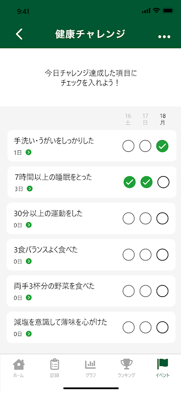 With “Kintore”, in addition to the health promotion challenges you set yourself, you can earn points for daily health promotion efforts such as walking, recording your weight and eating habits.