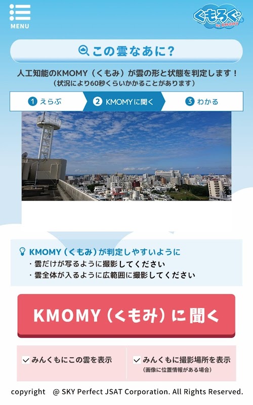 In the app "Kurogu" where you can learn about the weather while having fun, the artificial intelligence "KMOMY: Kumomi" determines the shape and state of the cloud you have taken, and records it along with the time and place like a diary. Will The judgment accuracy of KMOMY will be improved by about 85% (in-house investigation). Clouds of you and everyone judged by KMOMY can be searched by date / type / state.