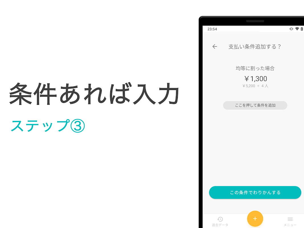 Free simple split app. You can look back on payment condition settings such as Mr. A's more and Mr. B's less, and past input data. Easy to copy and share.