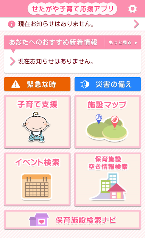 世田谷区の子育て支援情報や乳幼児の健康診断・予防接種のお知らせ等の提供や、幼稚園・保育園を現在地からの距離等の条件から検索することができるアプリです。
