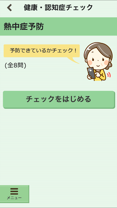 介護予防に役立つ4つのチェック機能(認知症の気づき、基本チェックリスト、こころの体温計、熱中症予防)。一部、履歴搭載ができます。