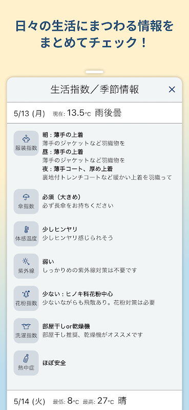 - Lifestyle index and seasonal information (last 2 days)