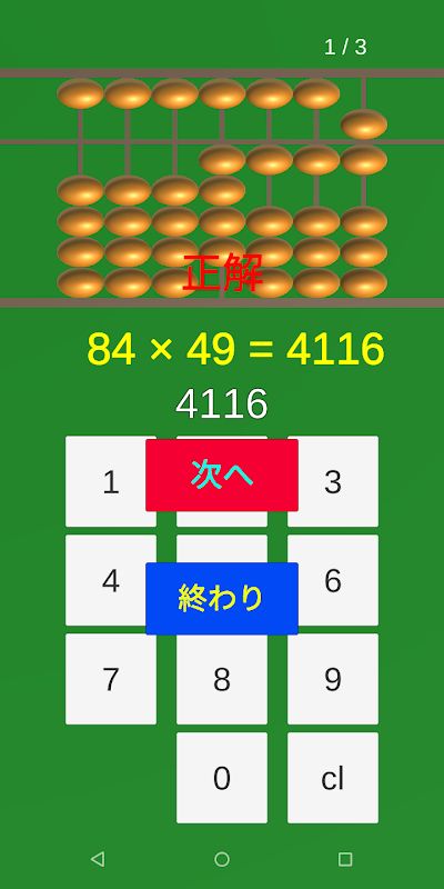 This is a mental arithmetic practice app where the beads of the abacus move according to the calculation problems.