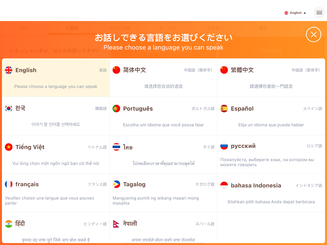English / Chinese (Simplified) / Chinese (Traditional) / Korean / Thai / Russian / Vietnamese / Portuguese / Spanish / French / Tagalog / Nepali / Hindi / Indonesian