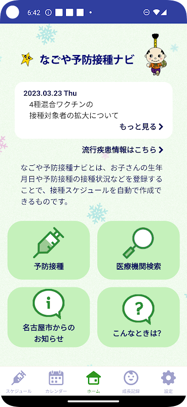 Nagoya City vaccination navigation. This app automatically creates complex and difficult-to-understand vaccination schedules. No detailed personal information is required; you can search for medical institutions, check up on health exams, and get information on infectious diseases, and receive schedule notifications via push notifications.