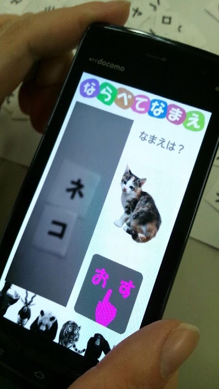 五十音のカードをならべて、動物の名前を作って遊ぶアプリです。