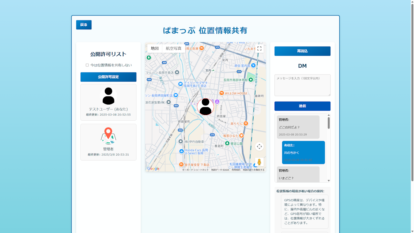 ・Share your location information and share what's happening at your travel destination by sending direct mail (DM) to your friends.