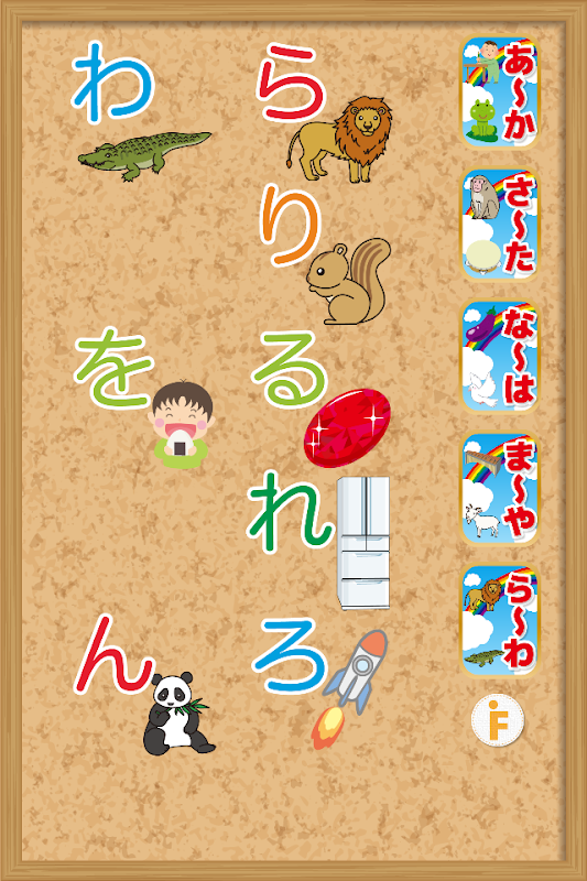 ひらがなをタッチすると、「あ あかちゃん」や「い いぬ」とおしゃべりをしながら動いて楽しみながら五十音を覚えられる子供・赤ちゃん・幼児向け知育アプリです。