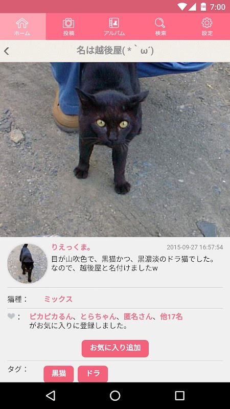 写真を投稿してみんなで共有したり、フォローしたり、お気に入りしたりした写真だけを見たり、猫種・キーワード・タグなどで見たい写真を検索する機能がついています。