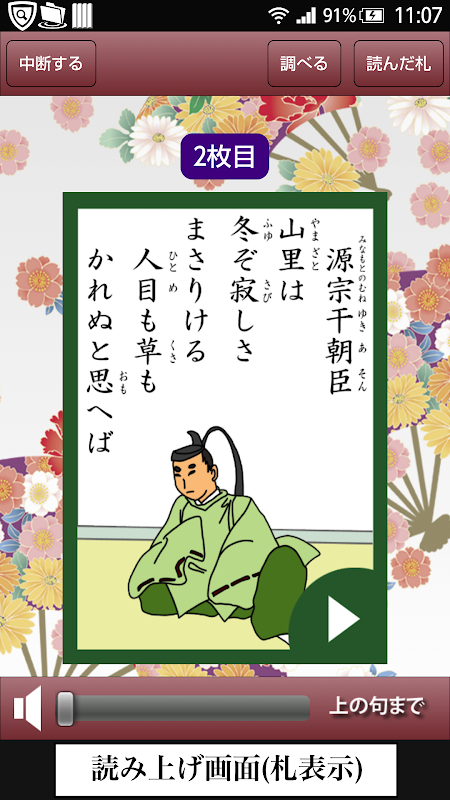 かるたの読み上げの他、短歌の意味や決まり字を調べる機能もあります。競技かるた用としてはもちろん、初めての方、百人一首について勉強したい方にもおすすめです。