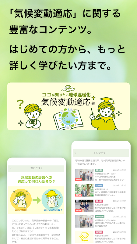気候変動影響は農作物の収量減少、自然災害の激甚化、熱中症などの健康増加など多岐に渡ります。各分野で適応に取組む方、行政として総合的に適応に取組む方へのインタビュー記事へのリンクを提供します。