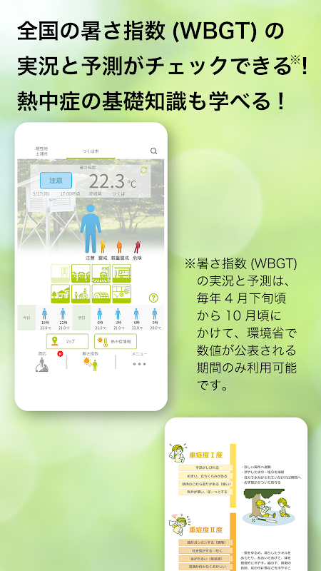 *このアプリで表示される暑さ指数(WBGT)の予測値と現在の暑さ指数の推計値(実況推定値)は、気象庁の資料に基づいて独自の方法で算出したものであるため、実際の値とは若干異なることがあります。「環境省 熱中症予防サイト」のデータを提供いたします。