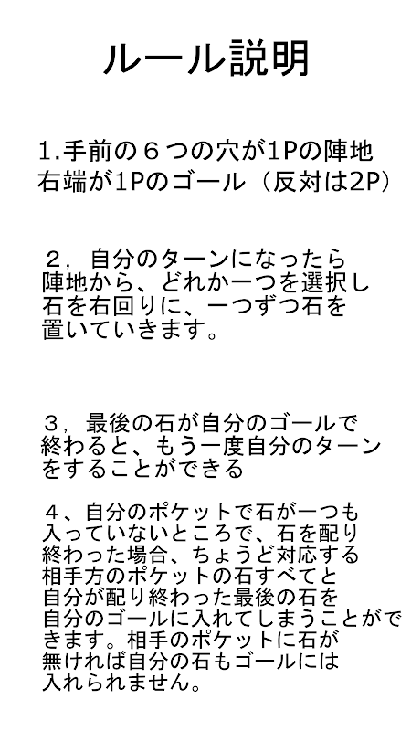 マンカラは100以上のルールがあるため、本アプリでのルールを説明をします。