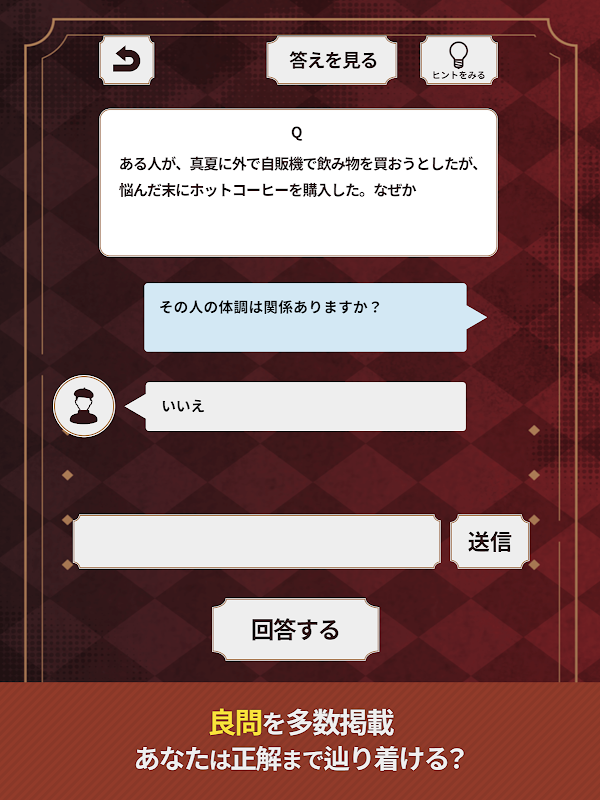 Sea turtle soup created by AI, lateral thinking game app now available! There are many puzzles that can be enjoyed in just a few minutes, making it perfect for free time or commuting to work or school. AI will ask you questions and test your inspiration.