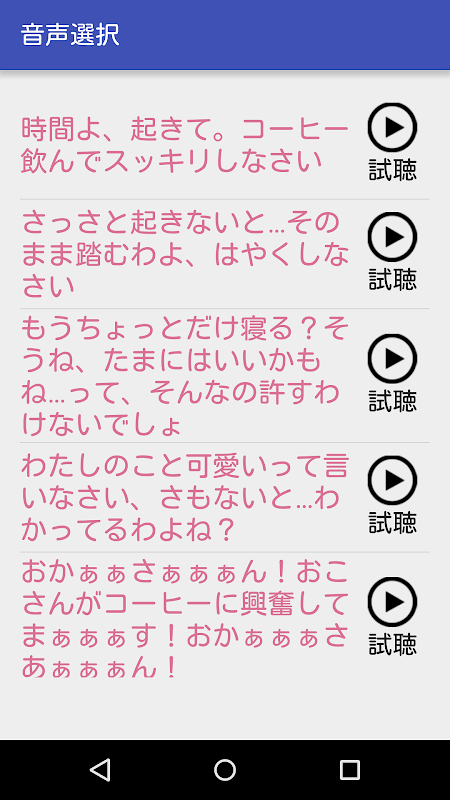 目覚まし音声のパターンは全部で6パターンです。