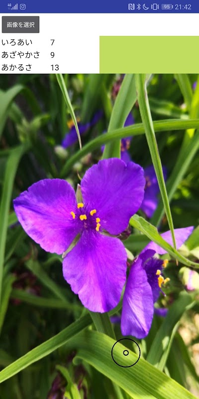 画像を選択し、色を知りたい場所をタップすると、「あつまれどうぶつの森」のマイデザインでの色選択スライダー位置(左から)に変換して表示します。