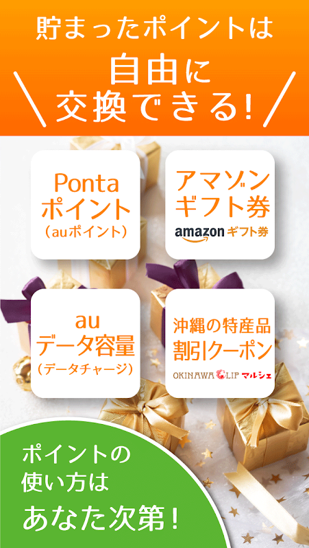 In addition, points can be accumulated by registering, and the accumulated points can be exchanged for Ponta points (formerly au points), Amazon gift certificates, and Okinawa special product discount coupons (Okinawa CLIP Marche). Furthermore, if you are an au user, you can exchange data traffic.