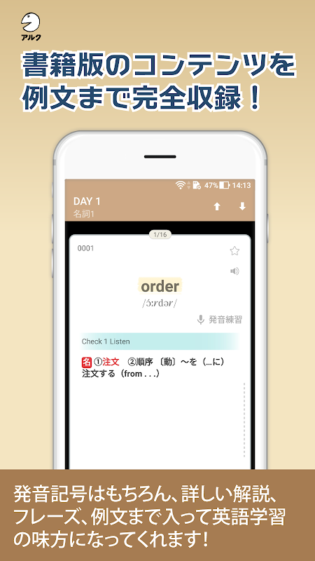 ・ 単語学習モード: 和訳、発音記号、派生語、例文を学習することができます。