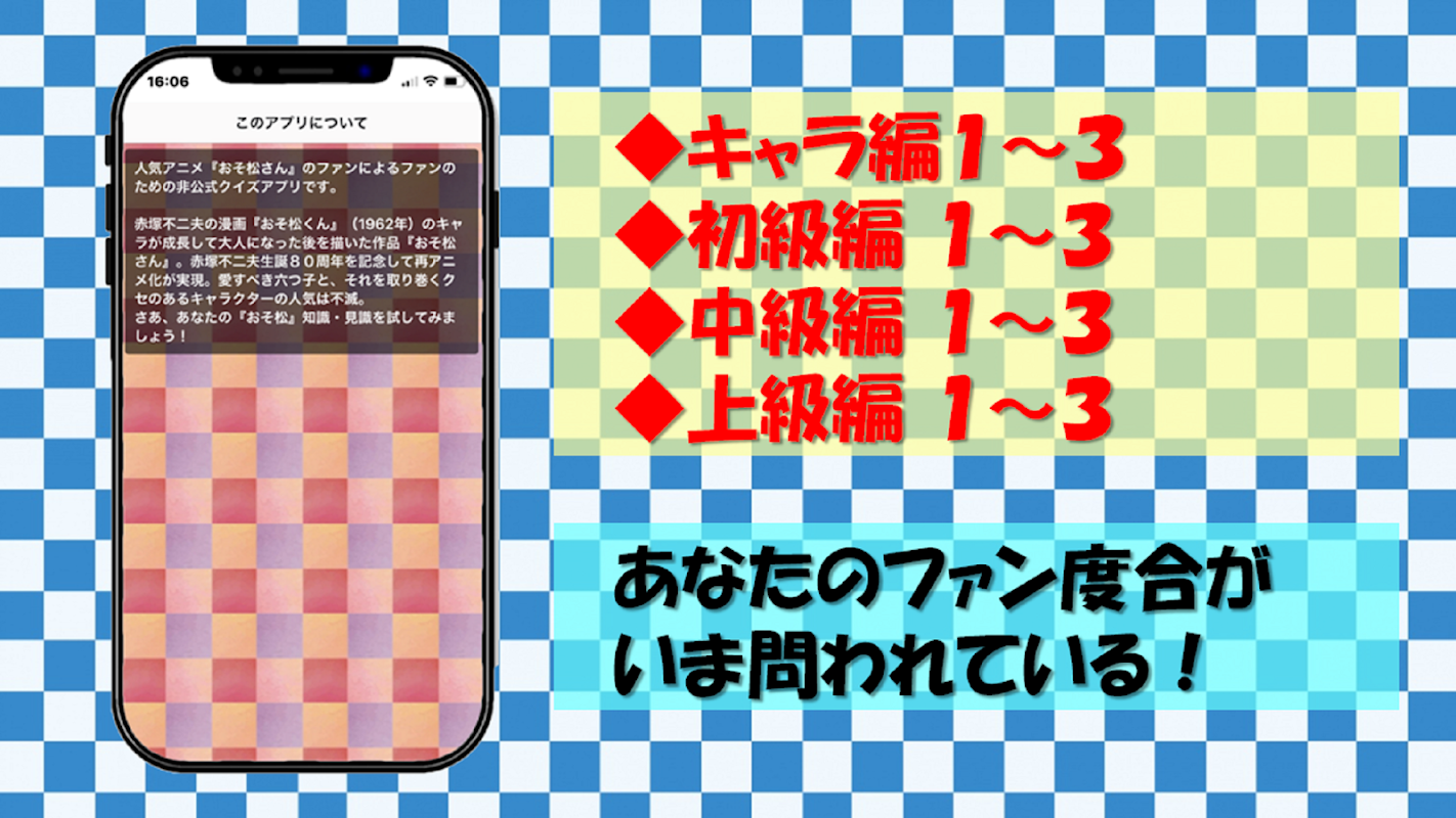 This is an unofficial quiz app for fans of the popular anime "Osomatsu-san".