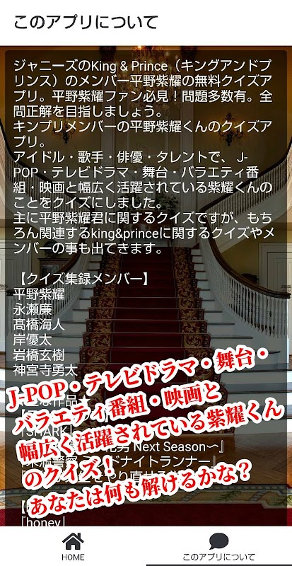 キンプリメンバーの平野紫耀くんのクイズアプリ。