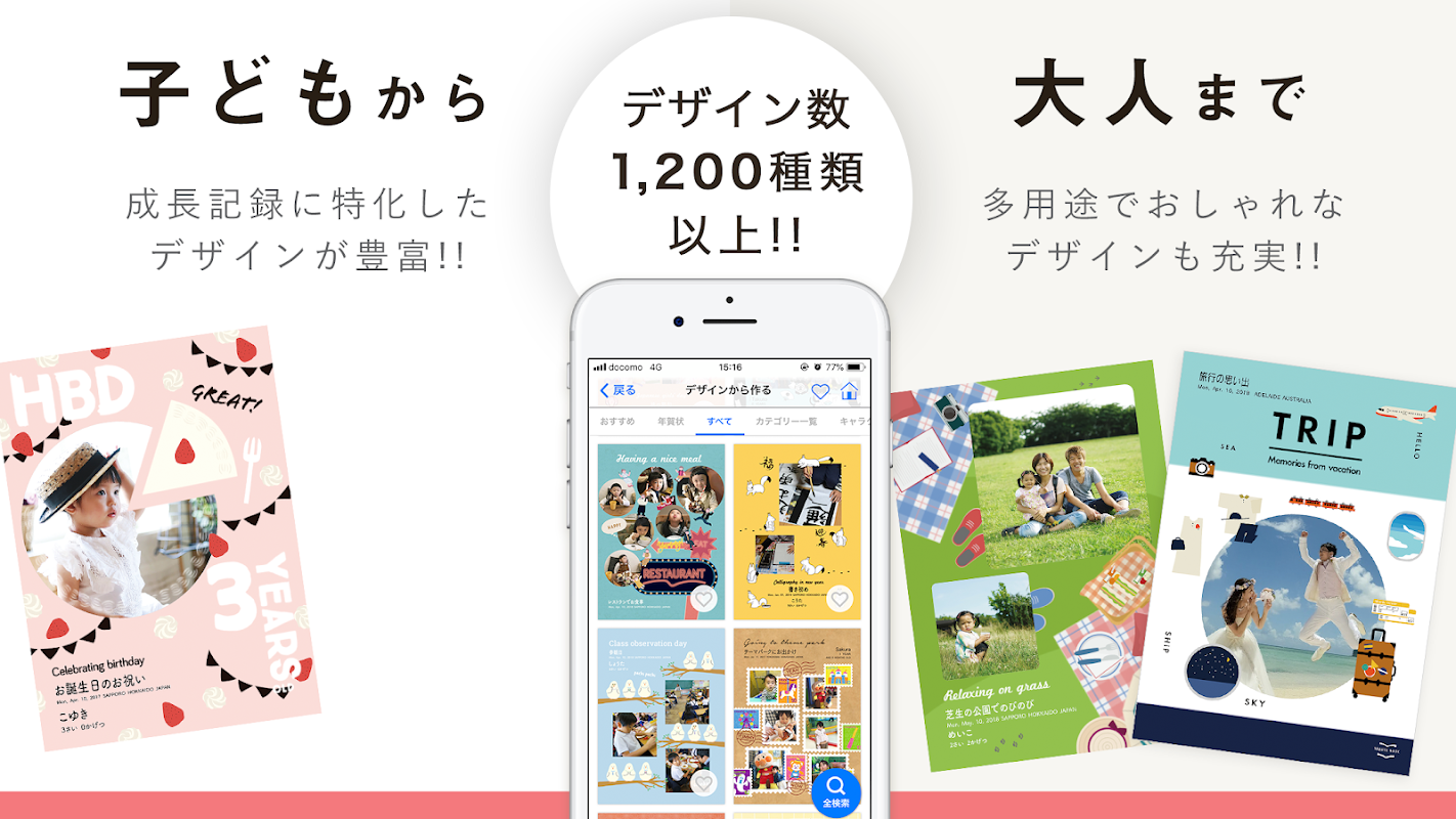 誕生日やクリスマス、お正月、夏休みなど様々なイベントをテーマとしたデザインに加え、何気ない日常もかわいい「作品」になるデザインが1,000種類以上もあるので、見ているだけでも楽しくなります。