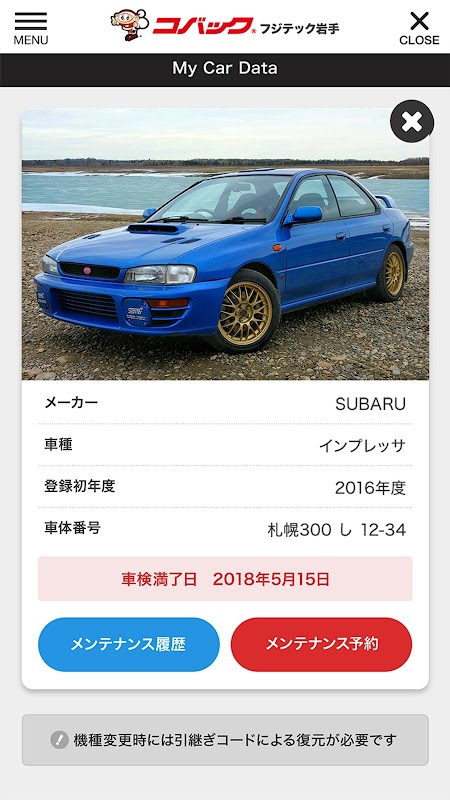 一度店舗へご来店いただきお車の登録がある場合、アプリに必要情報を入力していただくと、ご自身のお車の車検時期などがアプリ上でご確認いただけます!