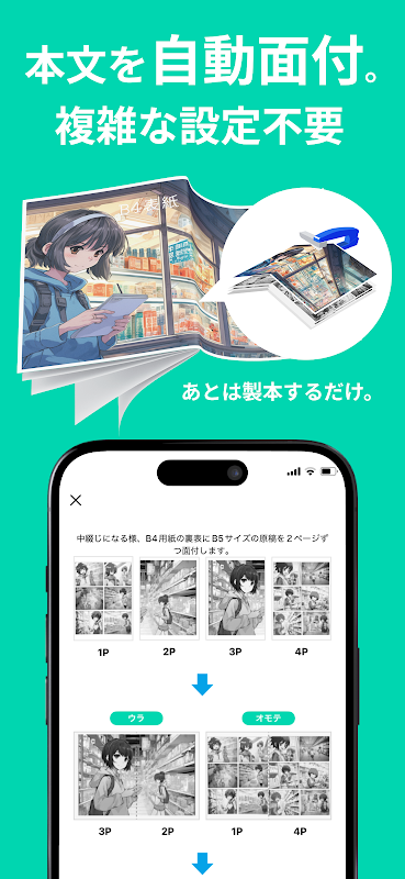 ・中綴じデータ作成: アプリが自動で本文を中綴じ用のデータに面付けし、連携するコンビニプリントサービス(※1)に送信。