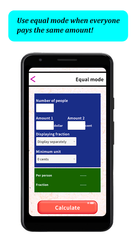 Enter the amount and number of people to calculate the amount per person. Use this mode when you want to split the same amount among all members.