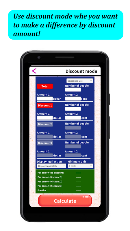 Enter the amount, the number of people in the group, the discount amount, and the number of people to whom the discount should be applied to calculate the amount per person. Use this mode when you want to specify and differentiate the discount amount between groups by age, gender, etc.