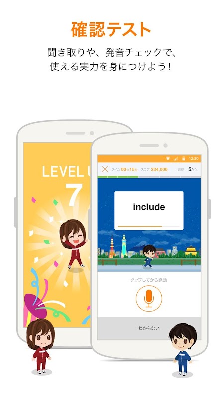 単語の意味を繰り返し学習する事で定着を狙う機能です。知らない単語を繰り返し学習する事で、しっかりと定着を図ることができます。また、音声付きの例文は全ての単語に付いており、英単語の暗記をサポートします。